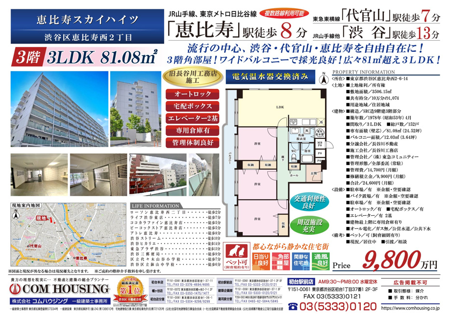 売主様より新規にお預かりした「恵比寿スカイハイツ3階 9,800万円」をご紹介いたします。