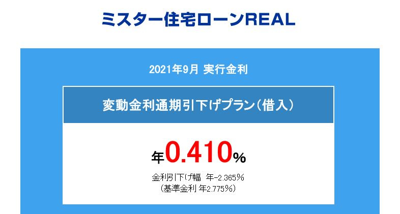 気になる2021年9月の金利は「0.410%」(新規借入・変動金利・最優遇の場合)。
