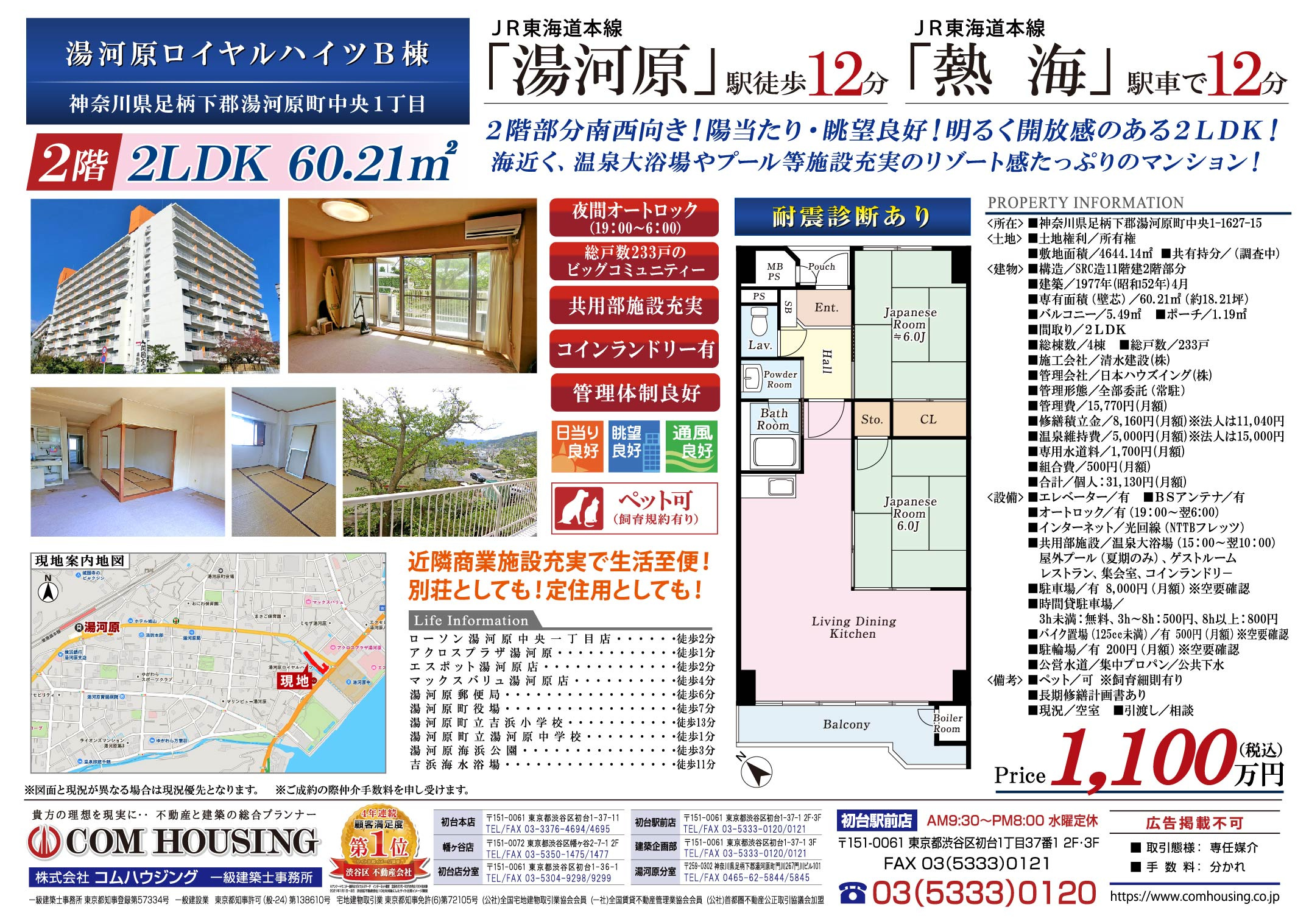 本日、売主様よりお預かりをしておりました「湯河原ロイヤルハイツB棟」をご契約いただきました。
