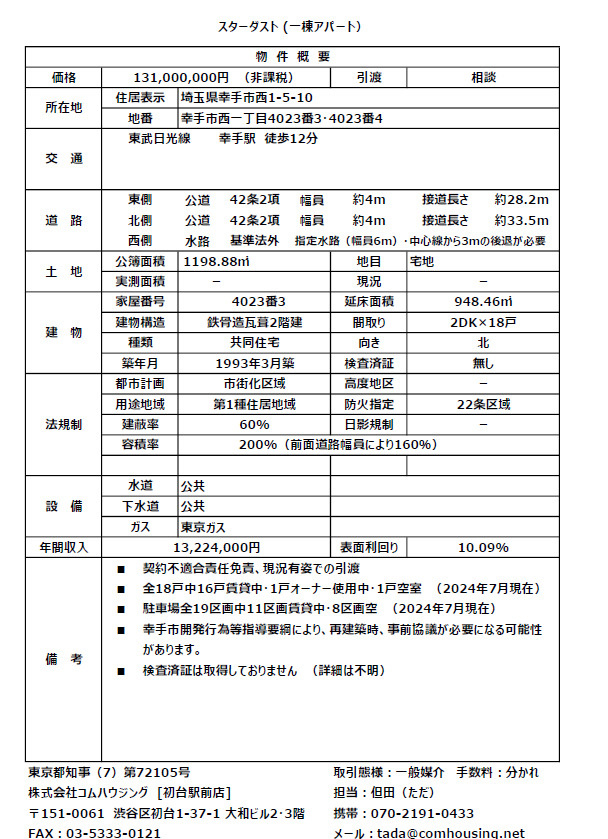 この度、わたくしがご所有者様からお預かりした一棟アパート「スターダスト」をご紹介させていただきます。