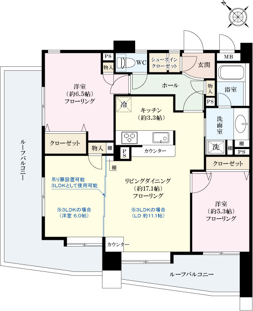 状況に応じて2LDKと3LDKを使い分け可能。72㎡超えのゆったり住空間。
